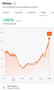 So I am just 2 weeks late with this check in/update, sorry about that I have some mental baggage that I am working on cleaning up around writing and sharing my story and not feeling like an imposter. I am currently doing a lot of work on self sabotage, because honestly I think there’s a lot there in my head that is holding me up with sitting down and doing the work with this blog. But aside from that I fee like over all my training is going well, like most people I have ups and downs, but overall I can feel my body getting stronger and my fitness returning which is exciting. Strava gives you a handy dandy graph of your fitness and I love seeing it returning.